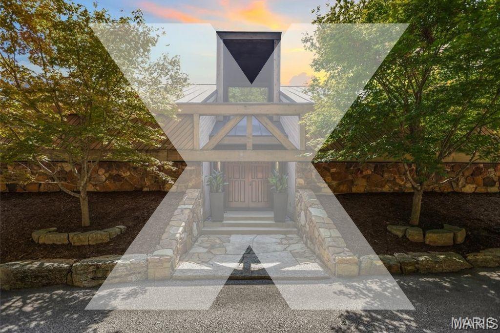 A true architectural masterpiece, this extraordinary 3.5-acre estate was custom designed & solely owned by a well-known St Louis-based architect, & offers sweeping, unobstructed views of the Meramec River Valley. With over 6,500sqft of total living space, this one-of-a-kind home is designed to showcase the landscape with a dramatic wall of windows that spans the main living areas, flooding the interior with natural light & treetop vistas for miles. Main level features formal dining, sleek modern kitchen, library, powder room, 2-story great room & family room divided by a see-thru fireplace. Private primary suite features vaulted sleeping area with skylight views of the stars & bath with freestanding soaking tub & custom walk-in shower. Discover another vaulted living space with a wall of glass, slate floors & 2nd large fireplace, a wide gallery-style hallway, & a stunning mudroom with circular staircase leading to a flexible upper level. This wing includes a 4th bed (currently used as an office with Murphy bed), full bath, & large-sized vaulted bonus space ready for your vision. Walkout lower level offers recreation space, kitchenette, full bath, & storage with additional laundry hookups. Separate exterior entrance leads to a full apartment with kitchen, living room, bed, bath & laundry. Multiple patios & stone pathways surround the home, creating extensive outdoor living spaces designed for entertaining & enjoying the scenery & breathtaking views.