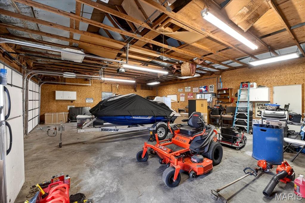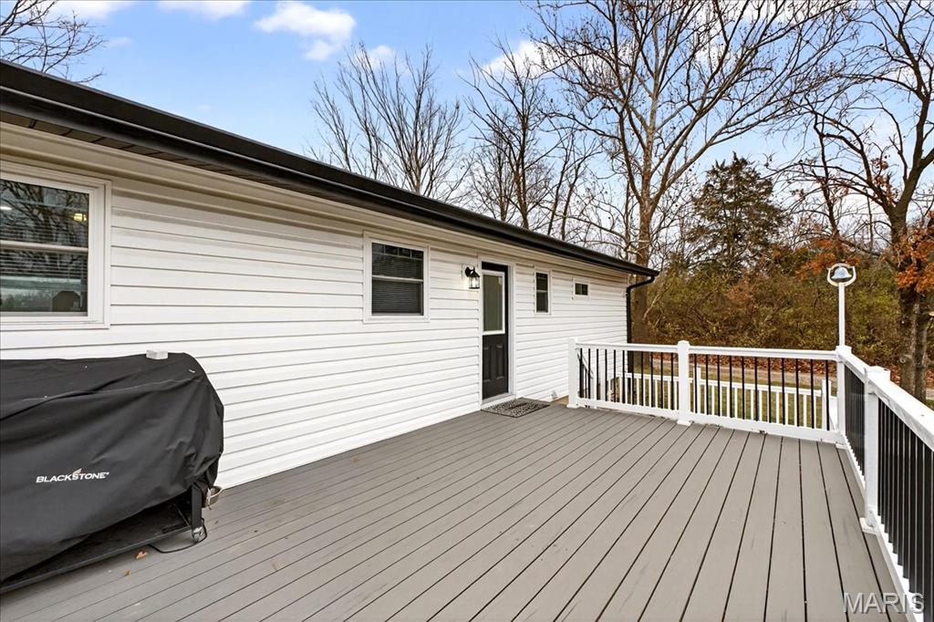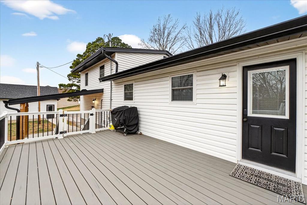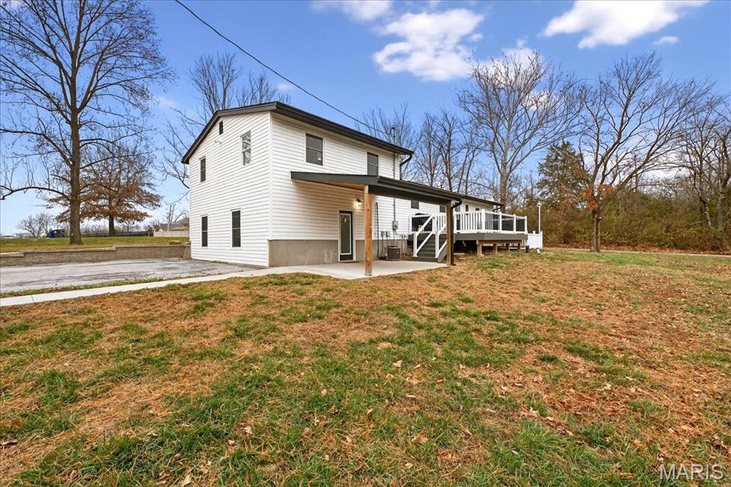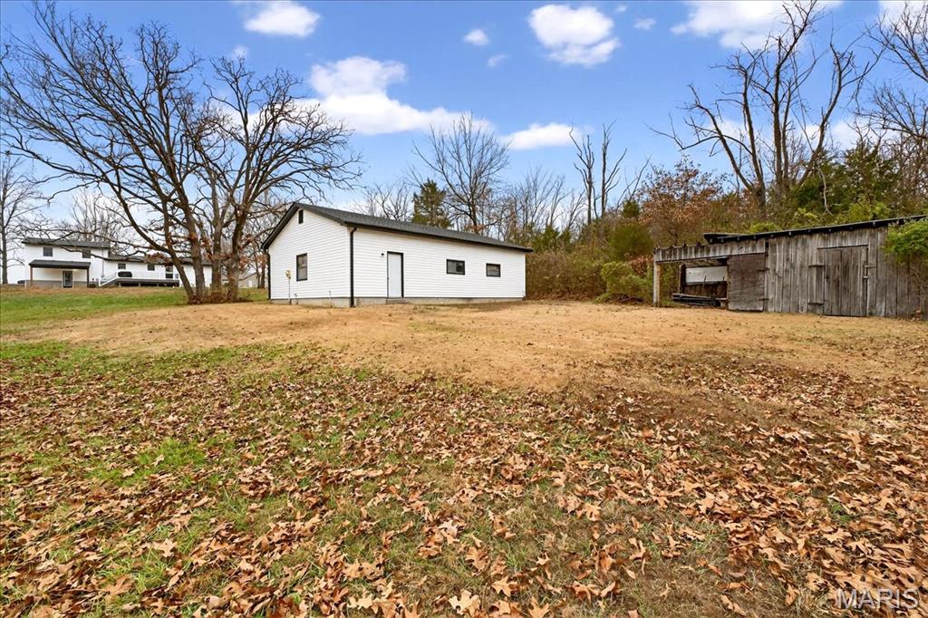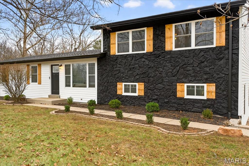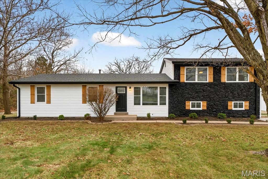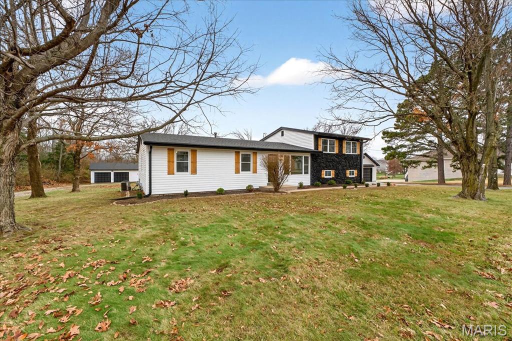 2.45 ACRES UPDATED and secluded just minutes from Civic Park in O'Fallon yet tucked away on a quiet street that feels like a private retreat. This beautifully remodeled 1 1/2 story home offers 1,612 sq. ft. of thoughtfully designed living space with modern finishes and incredible outdoor amenities. The exterior features a newer architectural roof, newer white siding, black gutters/soffit/fascia, and a striking black stone front with warm wood shutters, creating true modern-farmhouse curb appeal. You'll love the two impressive OUTBUILDINGS: a 624 sq. ft. detached garage with matching exterior to house and tall clearance for large vehicles, plus a massive 1,200 sq. ft. matching exterior to house outbuilding with two garage doors, two man doors, and a half bath—ideal for a workshop, car/boat/ATV storage, or gym. Inside, the updated kitchen features white cabinetry, solid-surface counters, a center island, backsplash, and laminate flooring, opening to the dining/hearth area for easy entertaining. The remodeled oversized primary offers a walk-in closet and full bath. The updated spacious hallway bath includes a double-sink vanity. The main-level laundry off the the kitchen adds modern convenience. The upper level includes an updated spacious family room with a stone gas fireplace. The basement features an updated rec room, sleeping area, full bathroom, and storage. Outdoor living spaces include an updated covered patio, fenced patio, and a maintenance-free deck overlooking mature trees and park like backyard. This property offers a rare combination of updated home + acreage + multiple outbuildings + privacy with all the amenities of town nearby—country feel with city convenience. Despite the private feel, you are minutes from restaurants, shopping, Hwy 70/364, parks, and more.