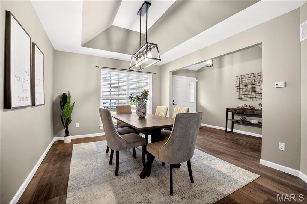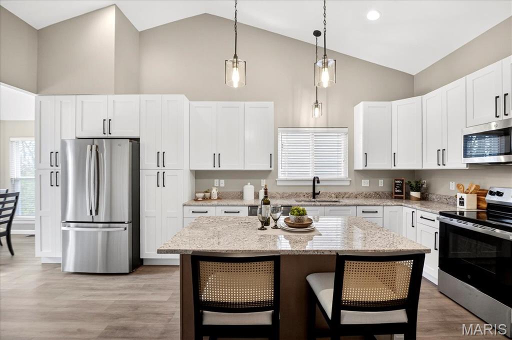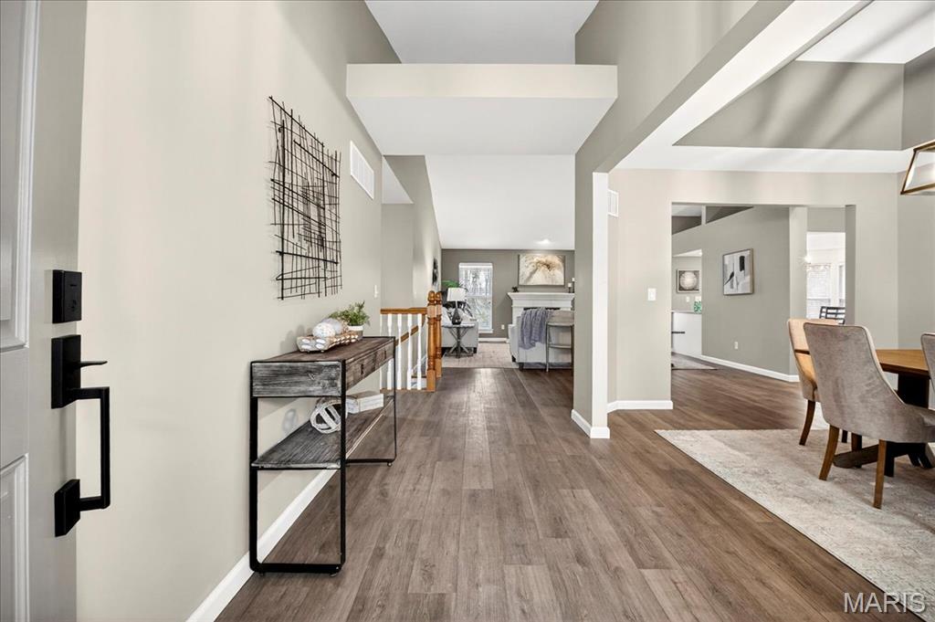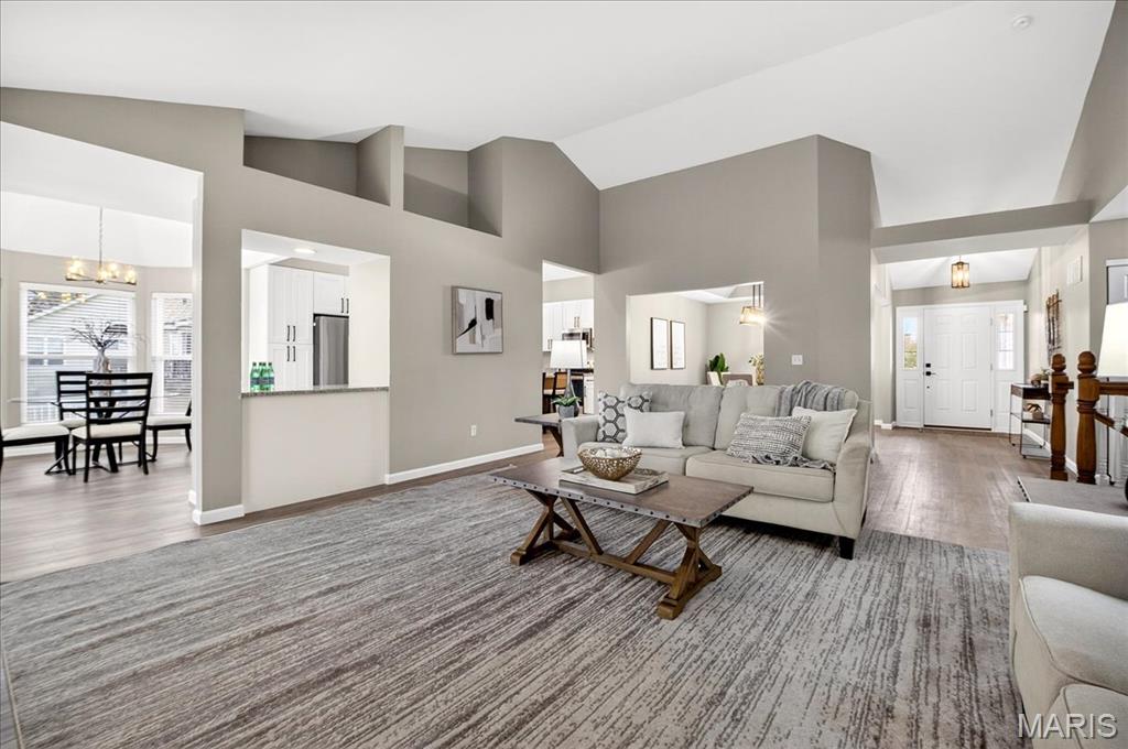 Welcome to this completely renovated Great Room ranch in the Villages of West Lake, offering modern updates and quiet wooded views. Step into an open, vaulted great room with a wood-burning fireplace and luxury vinyl plank flooring that carries throughout the entire main level. The remodeled eat-in kitchen features a center island, new appliances (refrigerator stays), ample cabinetry, and a sliding door that leads to a deck overlooking the wooded backyard. The main level includes four bedrooms and two fully updated bathrooms. The primary suite stands out with a bay window, custom walk-in closet, and a beautifully renovated ensuite featuring a separate tub and shower plus a double vanity. The main-floor laundry adds everyday convenience. The partially finished walkout lower level offers plush carpet, a powder room, a Sleeping Area, a massive storage closet, and direct access to the fully fenced, flat backyard, ideal for pets or play. Additional subdivision amenities include a clubhouse and community pool. Move-in ready with updated kitchen, baths, flooring, and thoughtful finishes throughout, this home blends comfort, privacy, and modern living in one of Pacific’s most desirable locations.