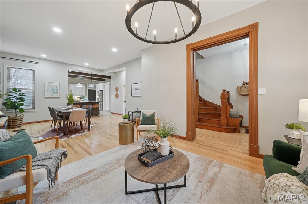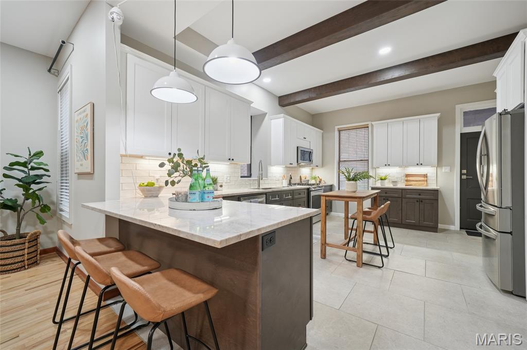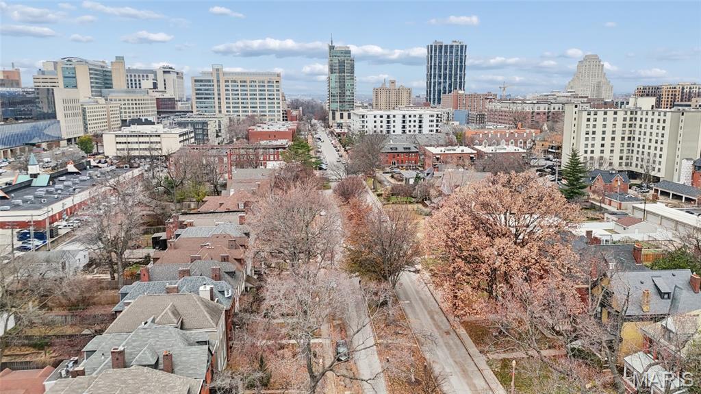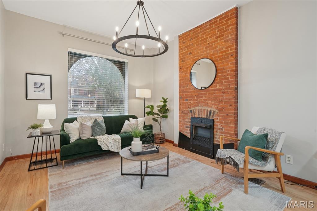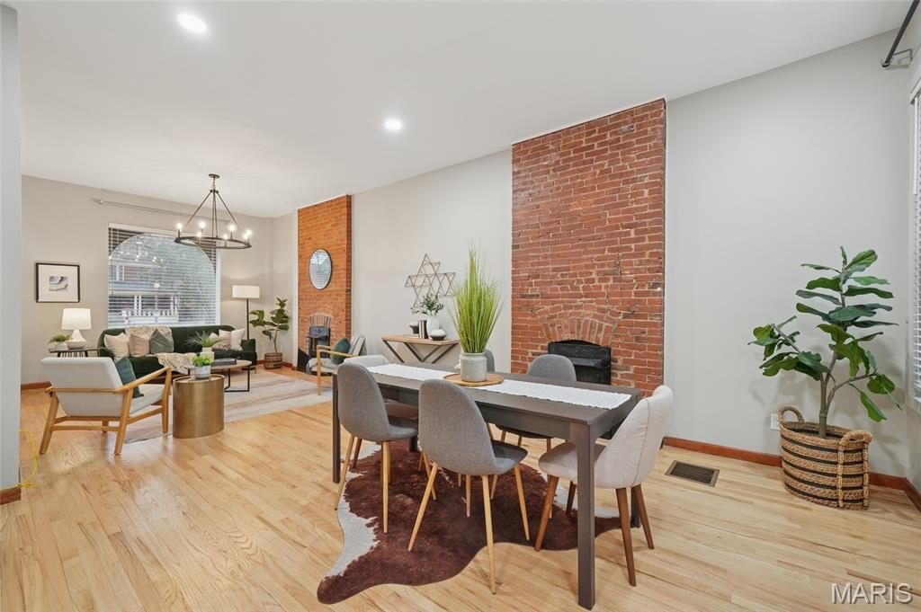 Located within this private street community of Laclede Place, this historic residence seamlessly blends timeless elegance with modern sophistication. Graced with 10-foot ceilings, rich wood floors, and original millwork, the home exudes warmth and refined character from the moment you enter. The beautifully reimagined living and dining areas provide an ideal setting for both intimate gatherings and upscale entertaining. Exposed brick accents and two striking fireplaces serve as architectural showpieces, enhancing the home’s distinctive charm. The gourmet kitchen is a chef’s delight, featuring marble countertops, stainless steel appliances, custom cabinetry, a breakfast bar, and a pantry. A chic, newly remodeled powder room completes the main level. Upstairs, the spacious primary suite offers a serene retreat with a generous walk-in closet and a luxuriously updated en suite bath featuring a double vanity and walk-in shower. A second bedroom and an additional full bath provide comfort for family or guests. The third-floor bedroom, recently refreshed, offers a versatile space perfect for a home office, studio, or private getaway. Outside, a fenced backyard creates a peaceful urban oasis with a large deck—ideal for alfresco dining—and direct access to the one-car garage.