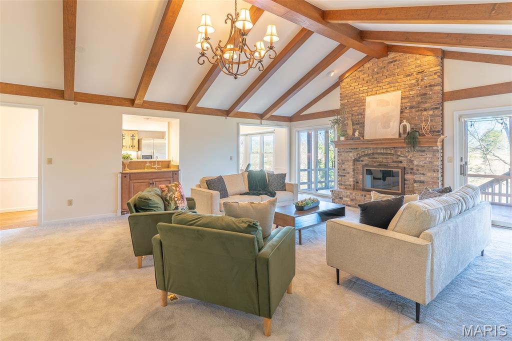 Nestled in the heart of the sought-after Greenbriar Estates subdivision, with Hole 4 of Greenbriar Country Club as the backdrop, this 4-bedroom, 3.5-bath home offers an exceptional combination of setting, luxury, and timeless appeal. Upon entry, a grand living room with exposed beams and a striking fireplace immediately captures attention, setting the tone for the home’s character and warmth. A spacious office and formal dining room flank the entrance, providing elegant and functional spaces for both work and entertaining. A wet bar seamlessly connects the living room to the kitchen, which features a generous center island with cooktop and an inviting seating area overlooking the golf course—flooded with natural light and offering picturesque views. A large laundry room with gas hookup serves as an ideal transition between the garage and kitchen, enhancing everyday convenience. Three bedrooms are located on the main level, along with two full baths and a half bath. The primary suite is a peaceful retreat, highlighted by large windows overlooking the course, a newly updated ensuite bath, and a walk-in closet. The finished lower level expands the living space significantly, offering an additional bedroom and full bath, a large living area with a wood-burning fireplace, an entertainment room complete with wet bar and pool table, and a newly constructed theater room. Ample storage and space for a workshop add even more versatility. Outdoor living is equally impressive, with an expansive covered and screened deck that opens to a beautifully maintained backyard gently sloping down to the golf course. Additional features include dual HVAC systems, a security system, self-dimming lighting throughout most of the home, and fresh finishes and paint throughout. With serene golf course views, abundant living space, and an unbeatable location, this beautiful Des Peres home offers a rare opportunity to enjoy privacy, comfort, and the lifestyle that Greenbriar Estates is known for.