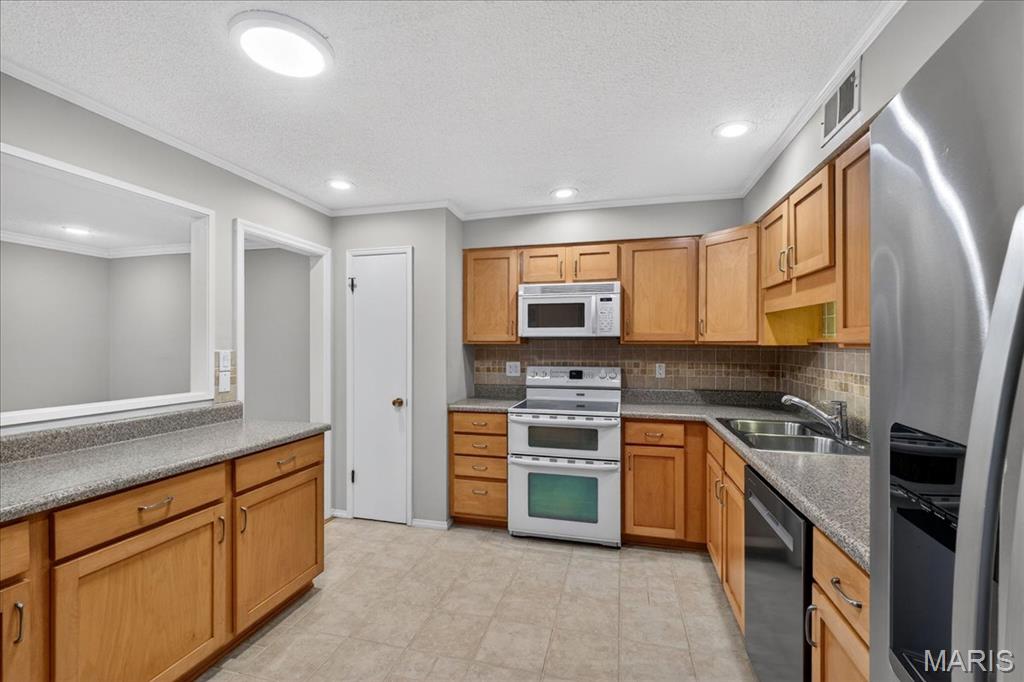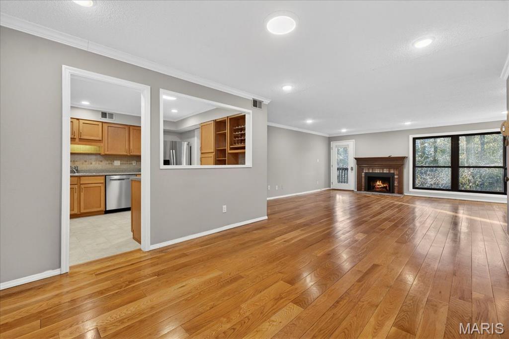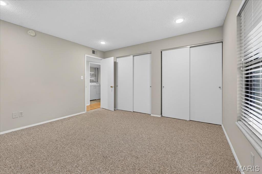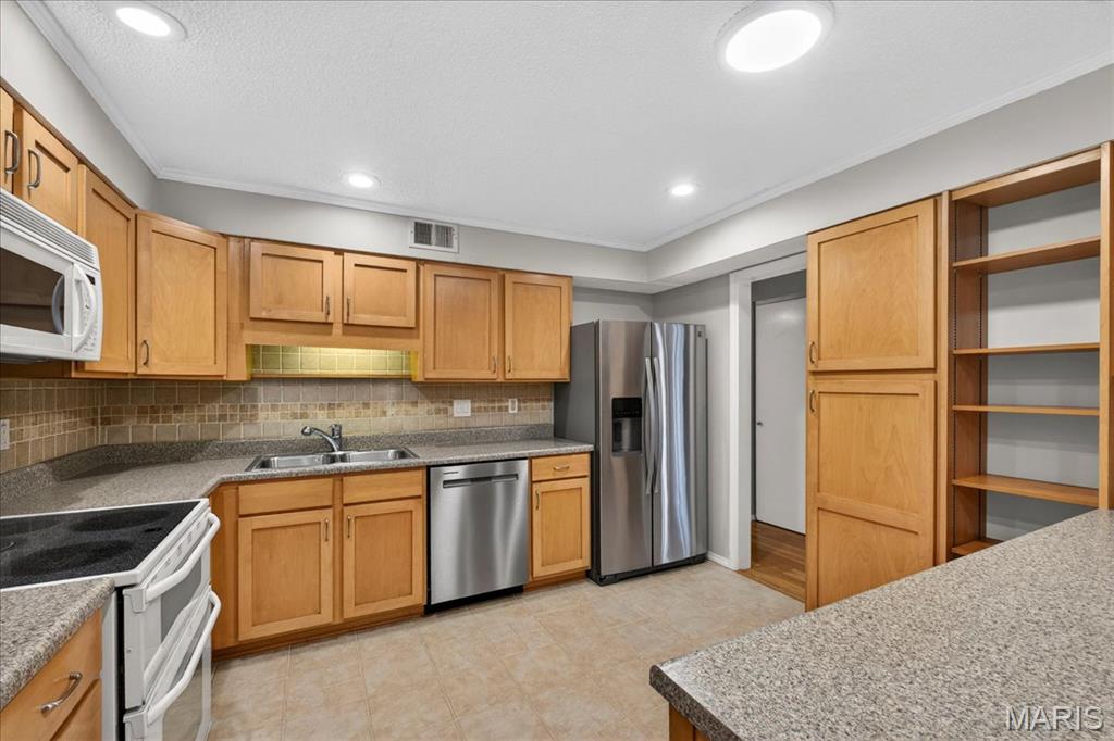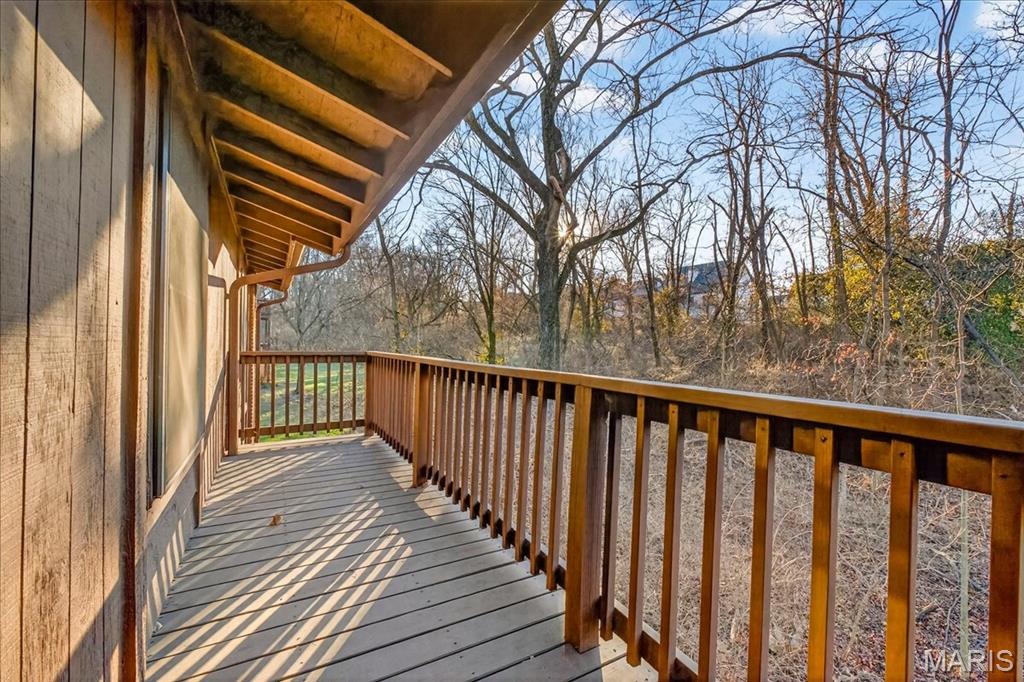 Welcome to this spacious 1,710 sq ft, three-bedroom, two-bath condo offering low maintenance living with exceptional light, privacy, and wooded views. Located on the second floor, the home features east- and south-facing windows that fill the space with natural light and newly rebuilt back deck. Located in the highly sought after Kirkwood School District, near shopping, grocery and entertainment. Mature woods behind the unit provide summer shade, privacy, and a peaceful setting. The layout includes a large primary bedroom, two additional generously sized bedrooms, two full baths, and ample storage throughout. One bathroom features a tub with recently updated cultured marble tile, while the second bath has a walk-in shower and double vanity. Two bedrooms offer walk-in closets, with additional hall and entryway closets for storage. Living and dining rooms feature wood flooring, with tile in the kitchen and baths and carpeted bedrooms. The kitchen includes laminate countertops, pantry storage, and pass-through opening to the dining area. All appliances convey, including refrigerator and dishwasher replaced within the past few years, electric double oven, microwave, and in-unit washer and dryer. HOA covers water, sewer, trash, recycling, exterior maintenance, and lawn care, with a separate HOA for the community pool, tennis courts, and clubhouse