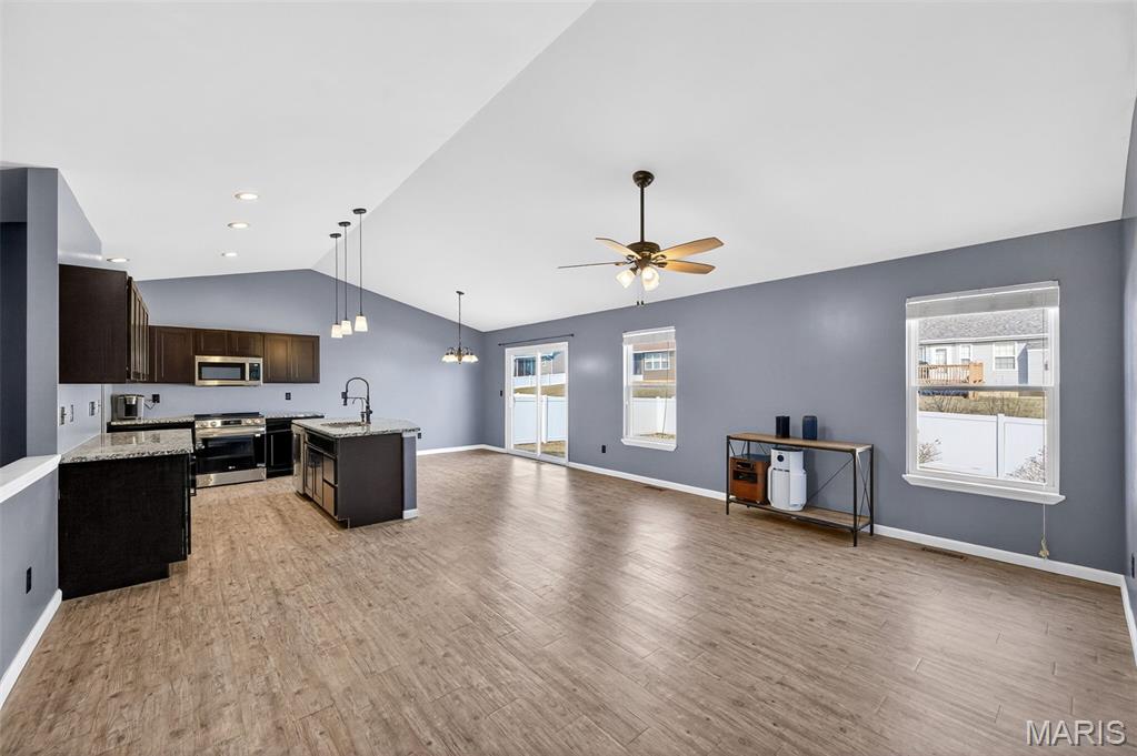 Vaulted ceilings, an open floor plan, a spacious primary suite, and a private fenced yard make this home a standout. Thoughtfully designed and well cared for, this home offers both comfort and functionality throughout. The kitchen features granite countertops, abundant cabinetry, and generous storage, opening to the dining area with walk-out access to an extended concrete patio—perfect for entertaining or relaxing in the fenced backyard. The primary suite is a true retreat with a walk-in closet, dual sinks, and a separate tub and shower. The unfinished basement is roughed in for a bathroom and ready for your finishing touches, offering room to expand. Additional highlights include an extra-wide, recently extended driveway, a heated garage, and recently added blown-in insulation for improved energy efficiency. Add to all this brand-new carpet in all the bedrooms, brand new stove, and brand-new microwave this home is move in ready!!