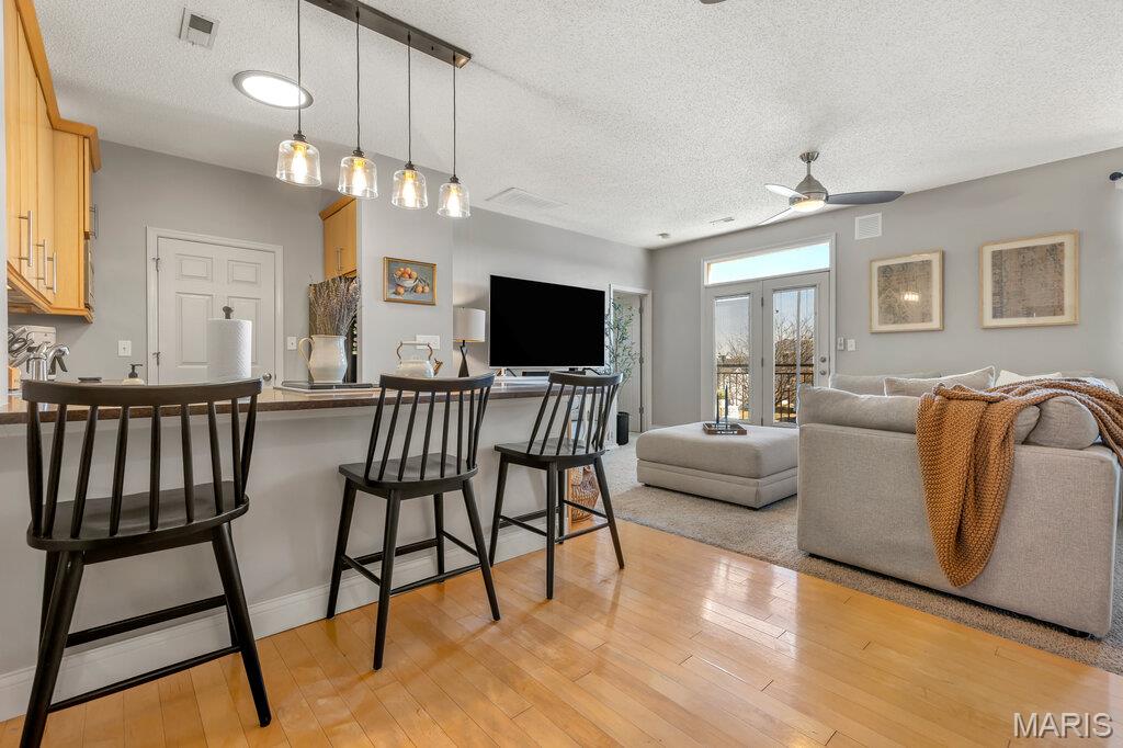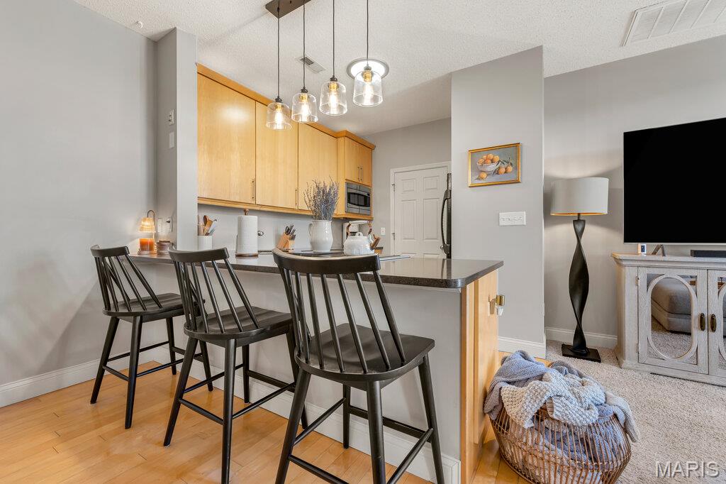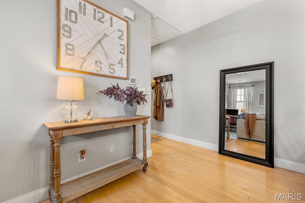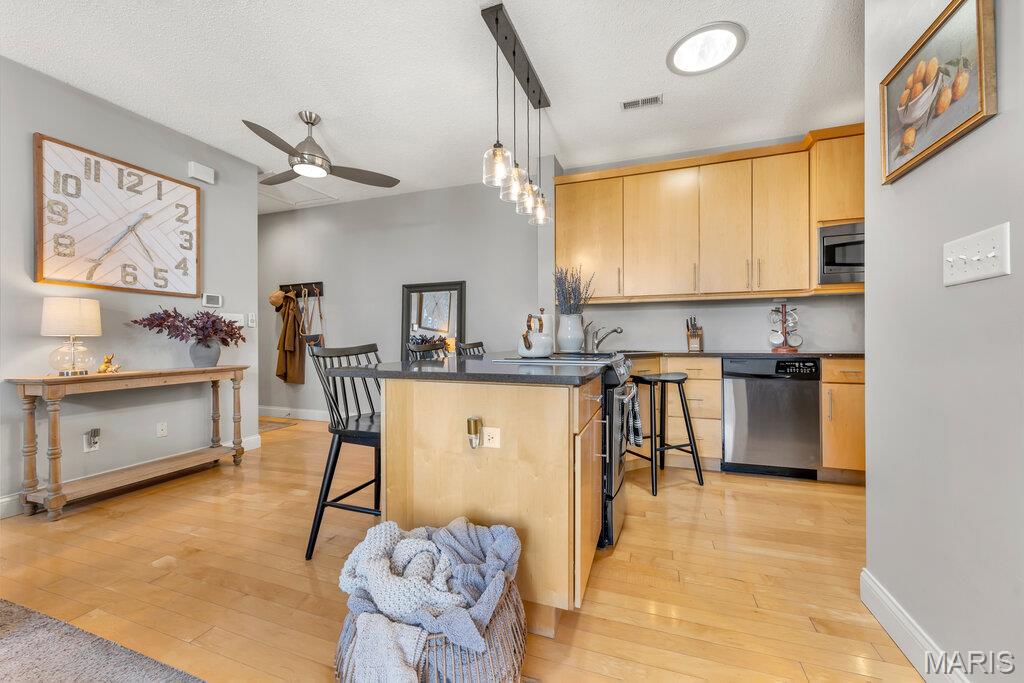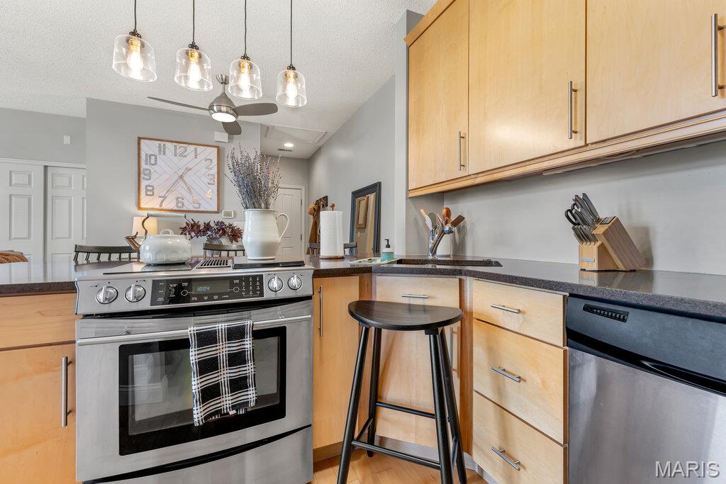 Experience refined urban living in this impeccably updated New Town residence. This one-bedroom, 1.5-bath condo features a seamless open floor plan anchored by rich hardwood flooring extending through the entryway and kitchen. The gourmet kitchen is a chef’s highlight, boasting 42-inch maple cabinetry with crown molding, solid-surface counter tops, and a functional breakfast bar. Retreat to the expansive owner’s suite, where a tastefully modernized en suite showcases elegant gold accents. Step outside to your private deck—an ideal sanctuary for morning coffee or evening grilling while enjoying neighborhood views. Additional premium features include an abundance of storage and a fully insulated private garage. Enjoy unparalleled access to the vibrant lifestyle and amenities of New Town in this move-in-ready gem.