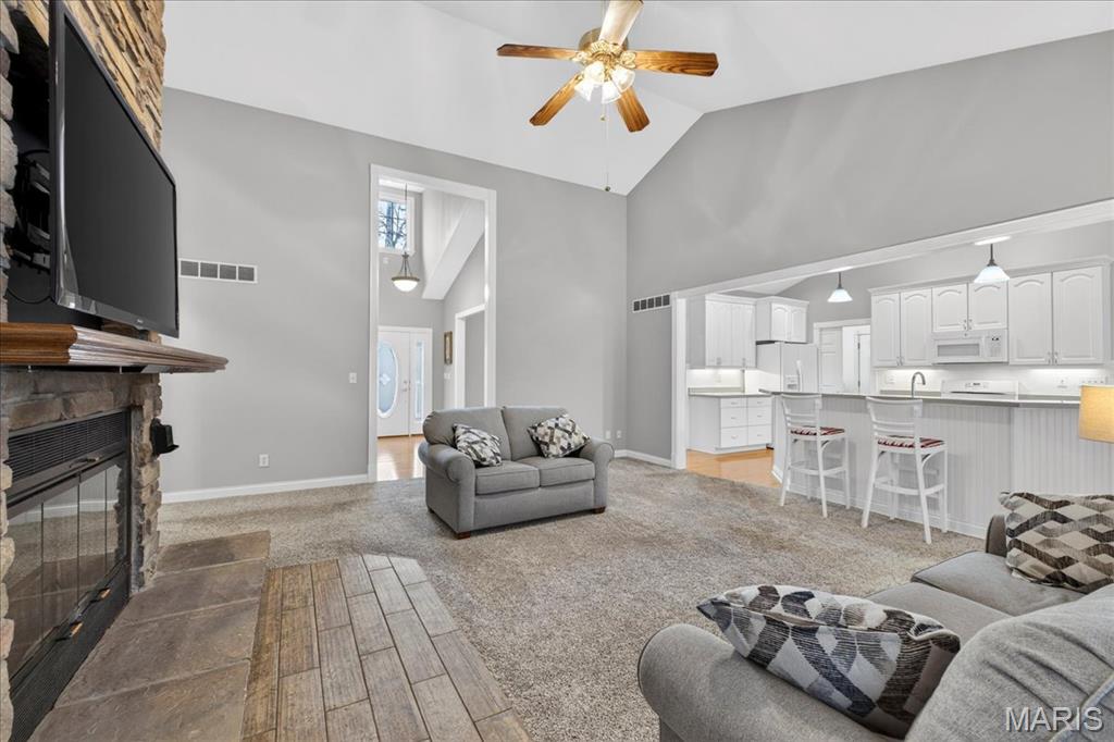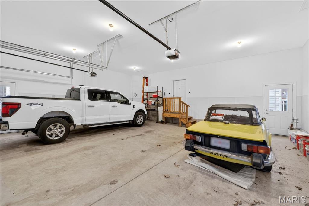 Meticulously maintained custom-built home situated on 3 beautiful acres! A charming covered wraparound front porch welcomes you into a vaulted entry foyer that flows into the formal dining room. The open floor plan features a stunning great room with vaulted ceiling and a gorgeous stone wood-burning fireplace, seamlessly connected to the kitchen offering abundant cabinet space, center island, hardwood floors, breakfast area, and pantry. Main floor laundry includes a full bath for added convenience. The divided bedroom floor plan provides privacy, with a spacious primary suite featuring a large walk-in closet and luxury bath with double vanity, separate tub, and shower. Two additional bedrooms are located on the opposite side of the home and share a full bath with tub/shower combo. The finished lower level boasts a massive family room with dry-stack stone ventless gas fireplace, built-in speakers, and a versatile bonus room ideal for a sleeping area, office, or workout space, plus a large storage area. Car enthusiasts and hobbyists will love the fully insulated drywalled 25x29 3-car attached garage and the 27x27 heated oversized detached garage complete with workshop area, room for vehicles, golf cart or side-by-side, and loft storage. The expansive concrete driveway offers ample additional parking. This exceptional property truly has it all included vinyl coated aluminum seamless siding —don’t miss your opportunity to call this DREAM home your own!