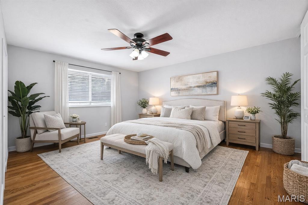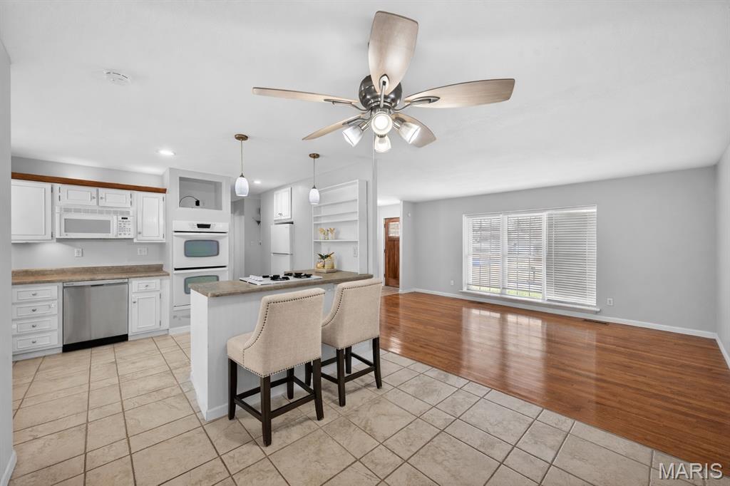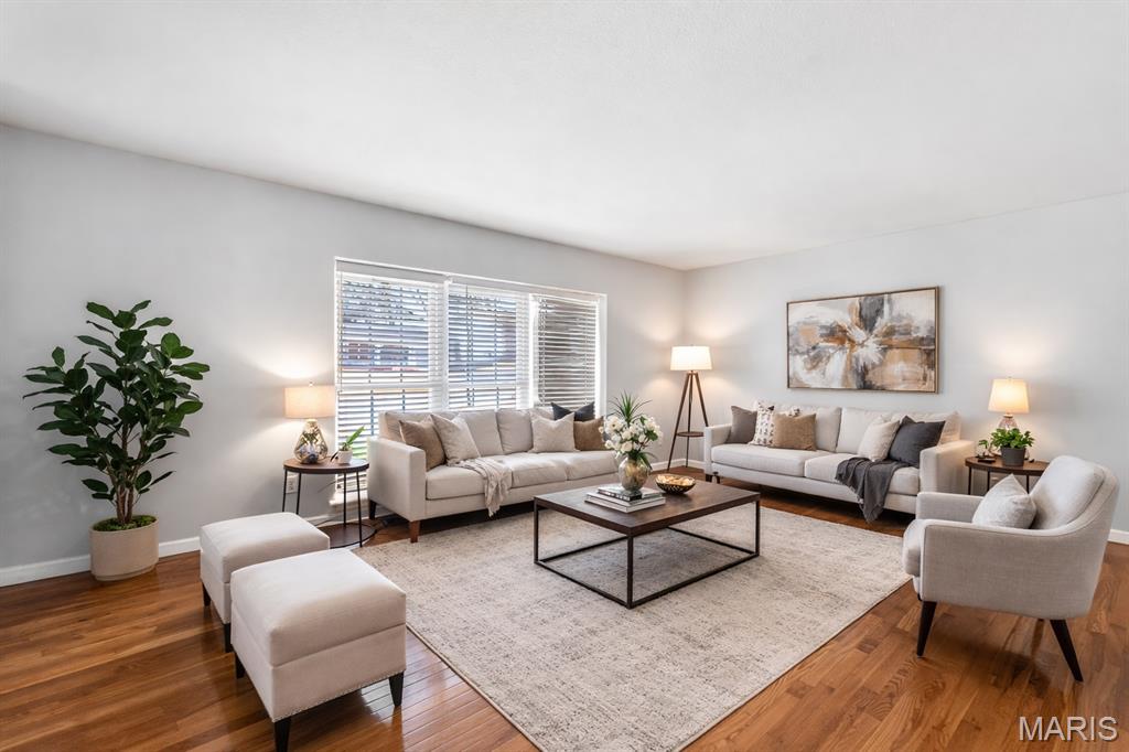 Maryland Heights just gained another home for sale. Don't miss out on this 3 bed, 2 full bath, ranch with over 2200sqft of finished space. Hardwood floors throughout the main level with tile in the kitchen and dining area. The dining room flows towards the kitchen and breakfast bar. There is a double oven and a separate cooktop with plenty of counterspace. The primary bedroom has its own full bath with shower. 2 other bedrooms accompany the main floor with another full bath. The basement is finished with all kinds of entertaining area, a bar, a pool table that stays with the home, and another family room. Out back is a huge patio that connects to the back of the garage with a second garage door! The yard is fenced in as well. Shopping, schools, rec centers, restaurants, and plenty more are conveniently close.