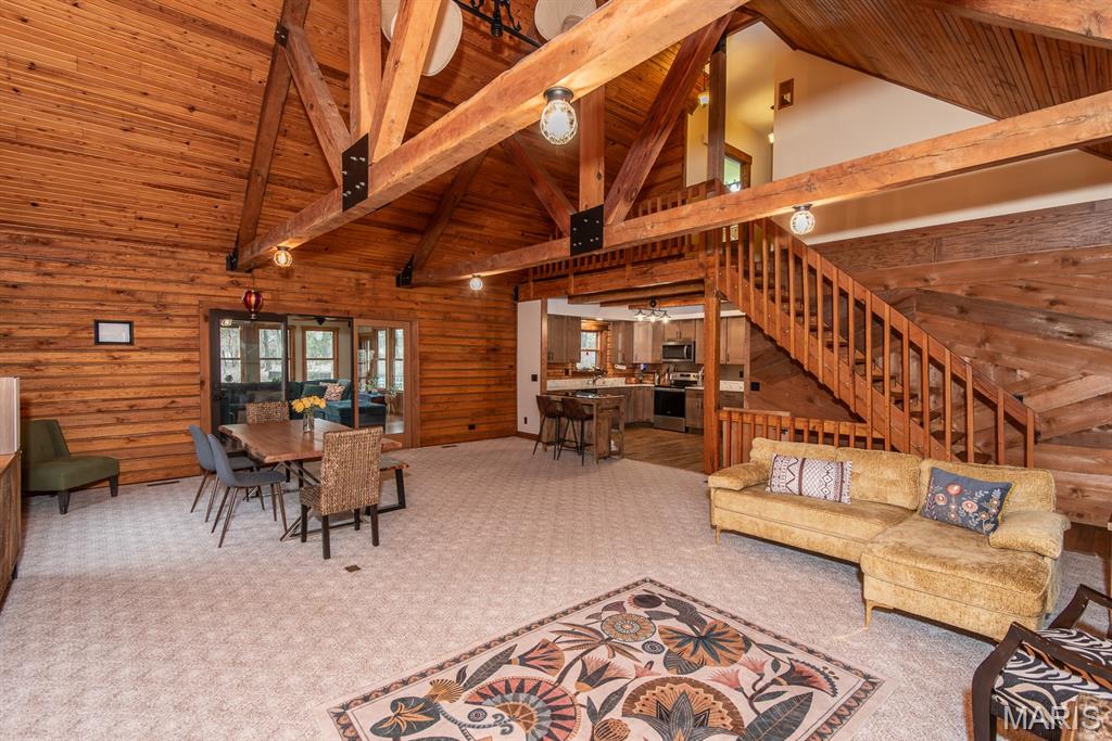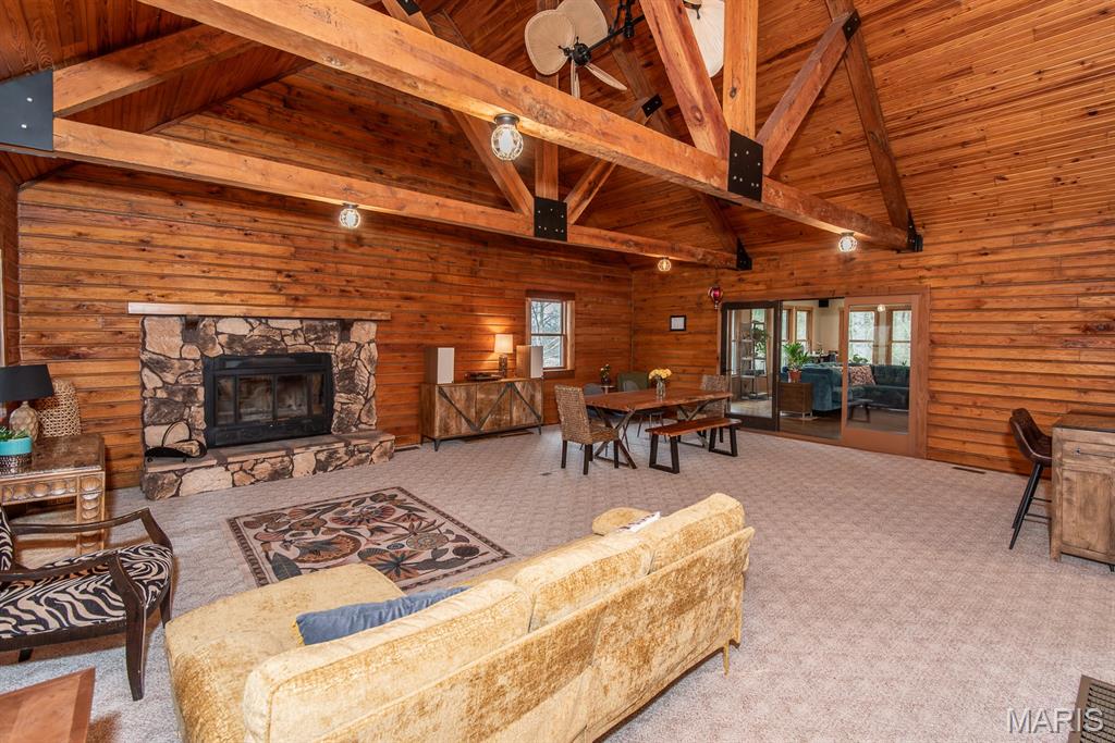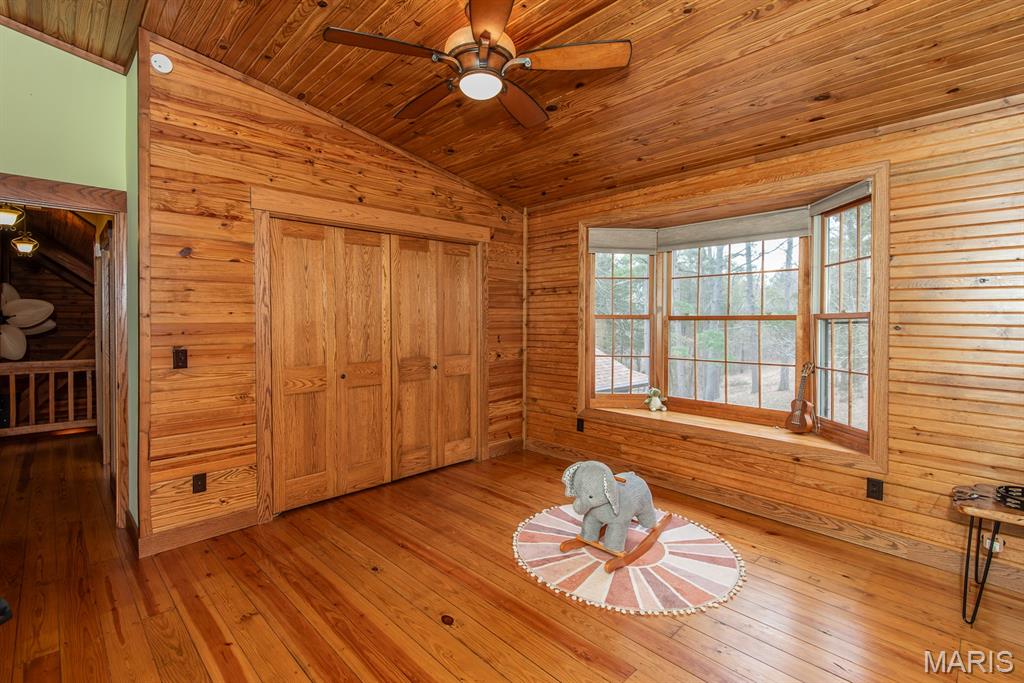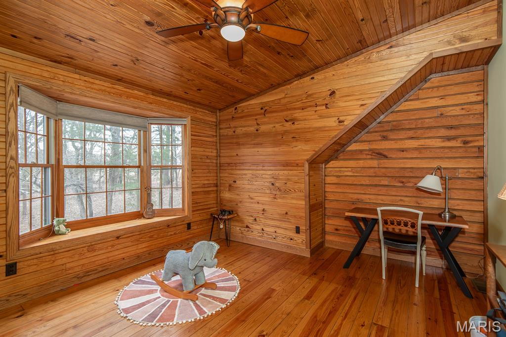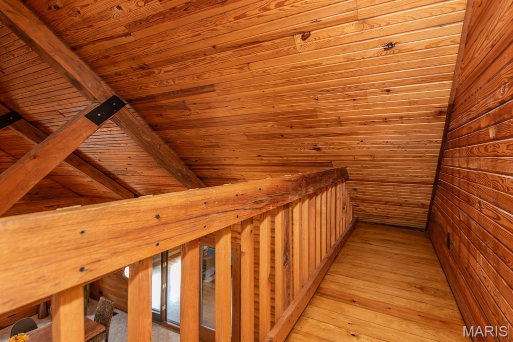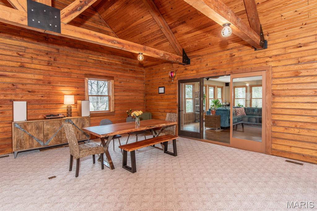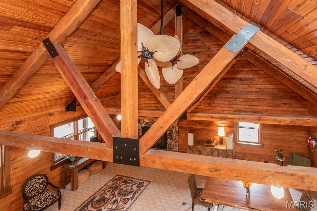 A rare Eureka retreat – 6.24 private acres with a thoughtfully designed custom 4-bedroom, 2.5-bath home that is both functional and visually stunning. Blending natural beauty, privacy, and convenience in a way that is increasingly hard to find, the property is surrounded by mature trees, wet-weather creek, and wooded views that create a true sense of escape while remaining just minutes from shopping, dining, and quick I-44 access. Imagine mornings spent on the porch with coffee in hand as sunlight filters through the trees, or ending the day with a quiet walk along your own private stretch of nature. Inside, the home showcases the craftsmanship and warmth expected in a true log home, featuring soaring vaulted tongue-and-groove ceilings, large windows filled with natural light, and an impressive stone wood-burning fireplace that anchors the main living space. The open living and dining areas create an inviting setting for everyday living or entertaining. The spacious main-level family room offers beautiful wood flooring and wall-to-wall windows with panoramic views. The thoughtful layout includes two bedrooms on the main floor with two additional bedrooms upstairs, ideal for guests, remote work, or hobbies. A partially finished walk-out basement with bathroom and an oversized 3+ car garage offer generous space for cars, outdoor equipment, and perhaps a few recreational vehicles. Lovingly and meticulously cared for, this home presents a rare opportunity for buyers seeking acreage, character, and convenience in one of Eureka’s most desirable settings