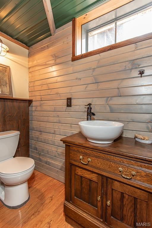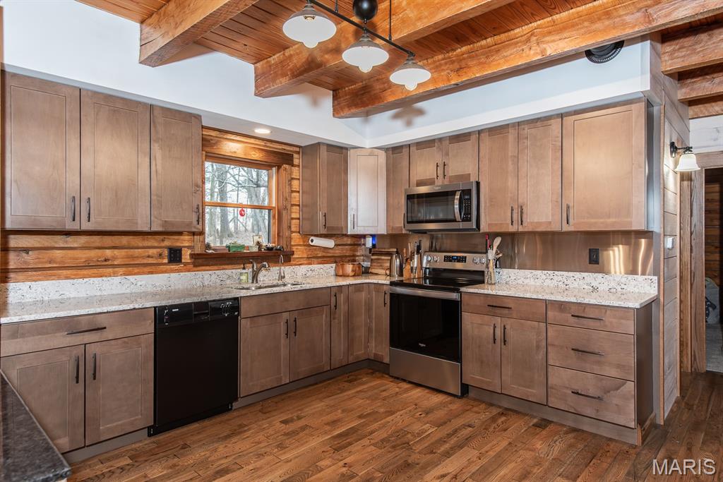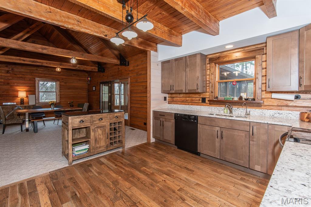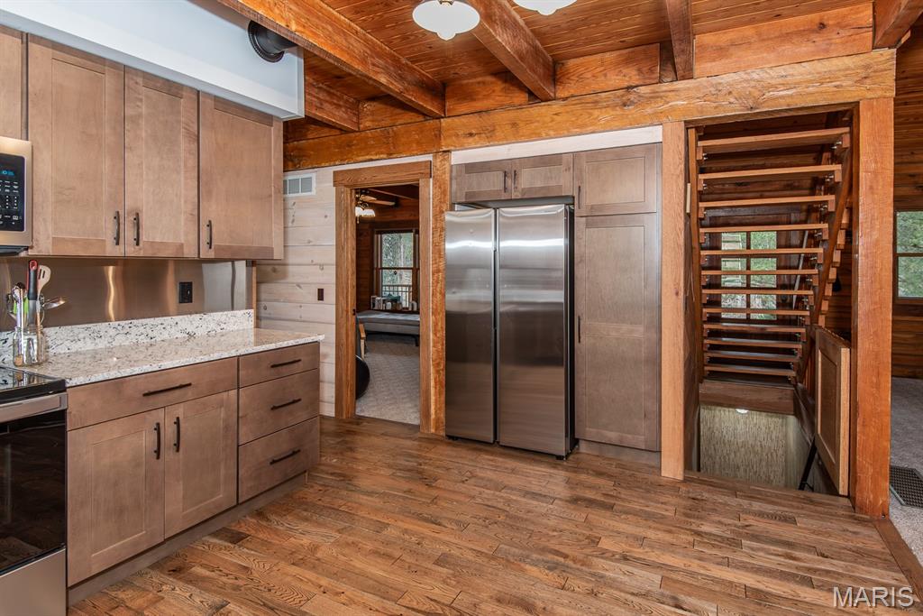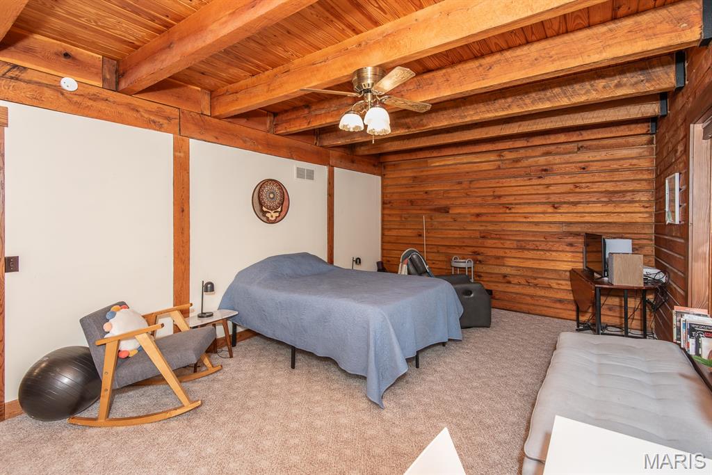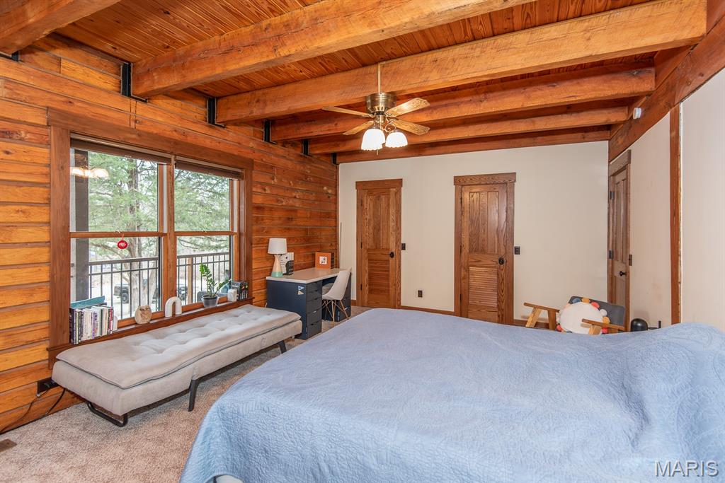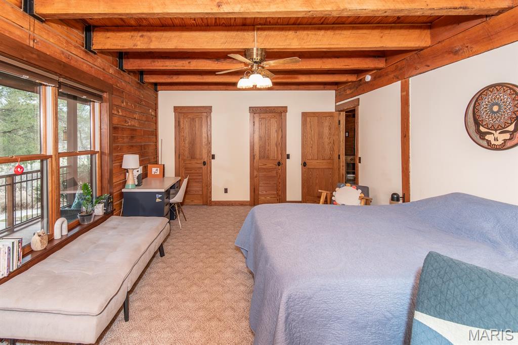 A rare Eureka retreat – 6.24 private acres with a thoughtfully designed custom 4-bedroom, 2.5-bath home that is both functional and visually stunning. Blending natural beauty, privacy, and convenience in a way that is increasingly hard to find, the property is surrounded by mature trees, wet-weather creek, and wooded views that create a true sense of escape while remaining just minutes from shopping, dining, and quick I-44 access. Imagine mornings spent on the porch with coffee in hand as sunlight filters through the trees, or ending the day with a quiet walk along your own private stretch of nature. Inside, the home showcases the craftsmanship and warmth expected in a true log home, featuring soaring vaulted tongue-and-groove ceilings, large windows filled with natural light, and an impressive stone wood-burning fireplace that anchors the main living space. The open living and dining areas create an inviting setting for everyday living or entertaining. The spacious main-level family room offers beautiful wood flooring and wall-to-wall windows with panoramic views. The thoughtful layout includes two bedrooms on the main floor with two additional bedrooms upstairs, ideal for guests, remote work, or hobbies. A partially finished walk-out basement with bathroom and an oversized 3+ car garage offer generous space for cars, outdoor equipment, and perhaps a few recreational vehicles. Lovingly and meticulously cared for, this home presents a rare opportunity for buyers seeking acreage, character, and convenience in one of Eureka’s most desirable settings