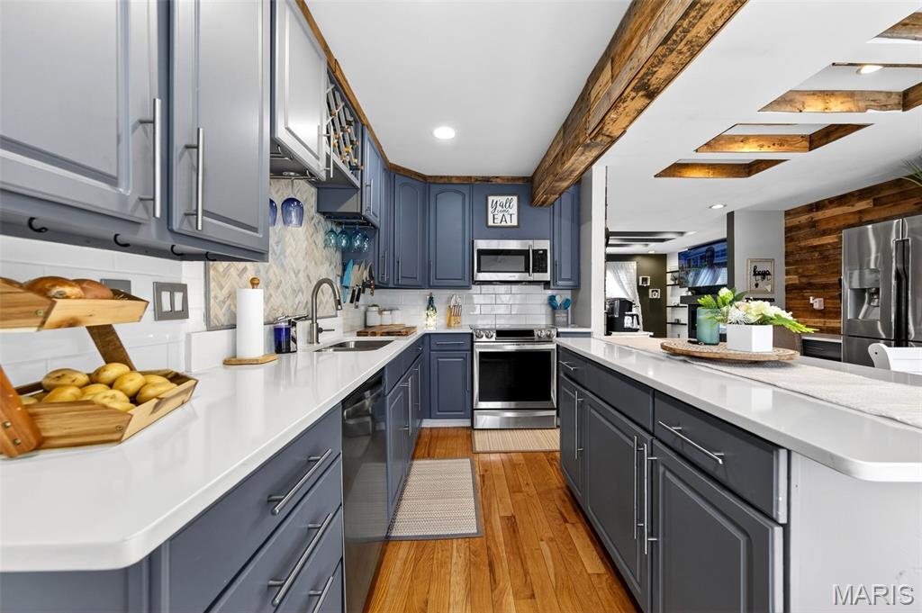 Welcome to 490 Electra Dr- this truly phenomenal home has been top to bottom renovated with meticulous detail. Hardwood floors lead you from the entrance through the open concept living area, flanked with impressive wooden beams, a stunning electric fireplace, built in storage, and recessed lighting. The kitchen is outfitted with long stretches of brand new quartz countertops, custom cabinetry, and stainless steel appliance, along with a large kitchen island providing extra seating and prep space. The primary bedroom suite is a dream to behold- a cozy sitting area, walk-in closet, massive en suite bathroom with a soaking tub and walk in shower. The second main story bedroom is generously sized and a conveniently located full bath has been updated with modern finishes. Downstairs is entertaining heaven- a 10 ft long bar, swanky speak easy, massive rec space, two large bedrooms, a stunning full bath, laundry room, and extra storage are just some of the amazing features that flush out the lower level. Escape to the oasis of the backyard- an amply sized patio leads down a lit and landscaped rock path to the large, level, fully fenced lot. Shade underneath the charming gazebo, or serve up drinks at the outdoor bar, which can easily be finished. The garage has sealed flooring and the recently expanded driveway allows for 6 cars to be parked. You won't want to miss this one!