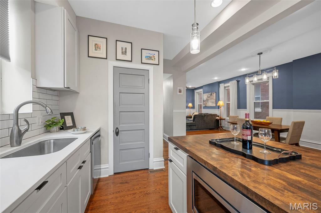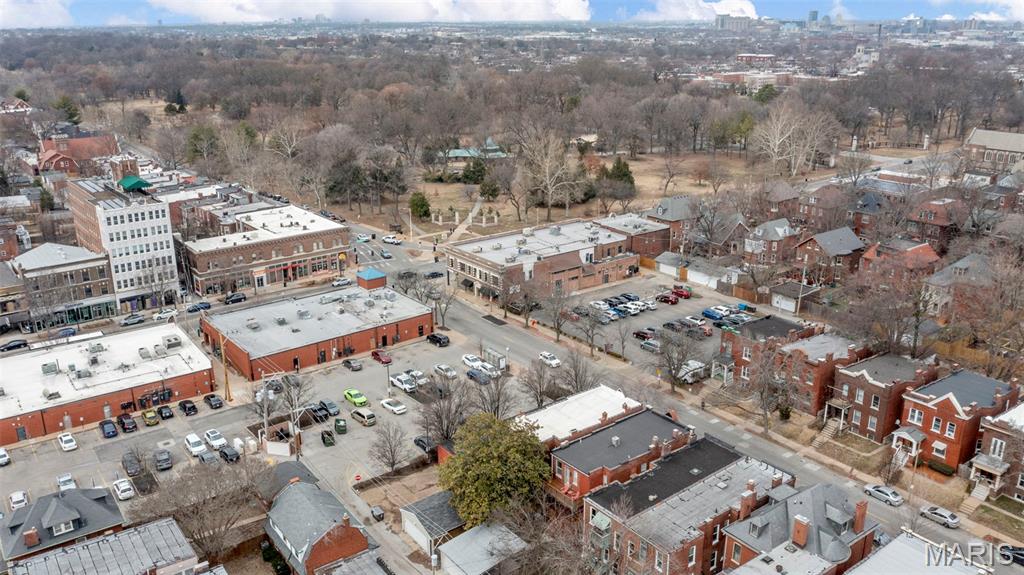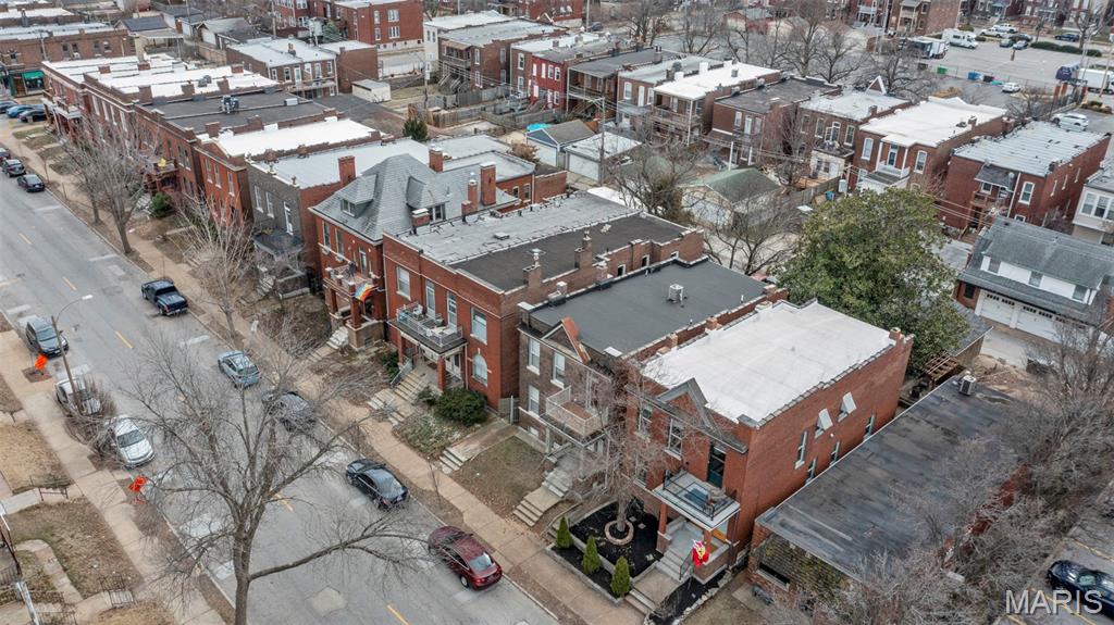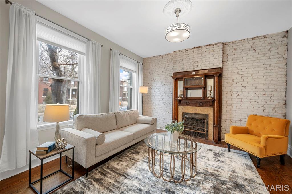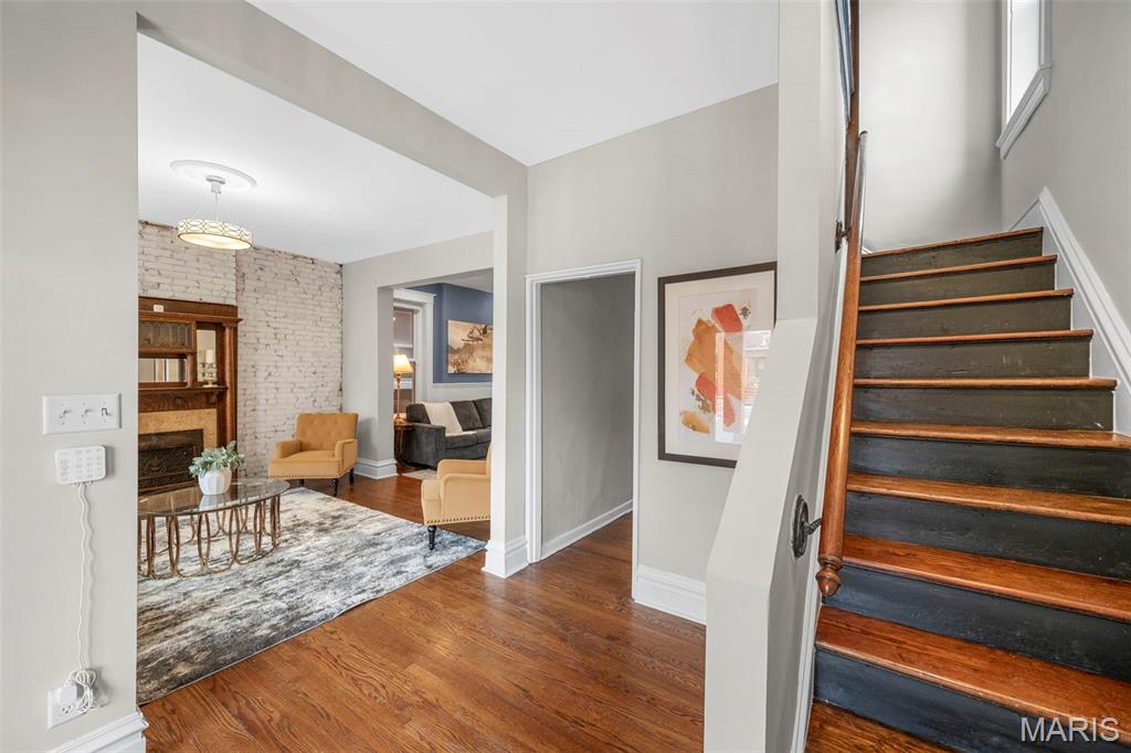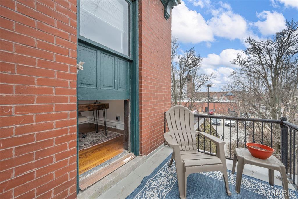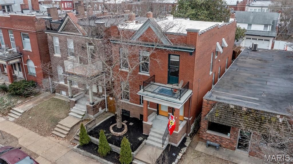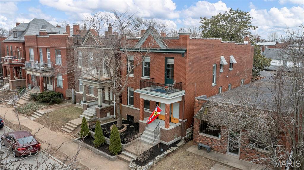Live beautifully in the heart of Tower Grove East. This impeccably restored 1909 brick home pairs historic character with the refined updates today’s professionals expect—just moments from morning jaunts with your pets in Tower Grove Park and dinner reservations along South Grand. Inside, soaring 10-foot ceilings, rich hardwood floors, and a striking mahogany fireplace mantel create a warm, elevated atmosphere. The open-concept main level is designed for both effortless entertaining and relaxed evenings at home. The thoughtfully updated kitchen blends style and function with quartz and butcher block countertops, white shaker cabinetry, gorgeous inlaid hardwood flooring and stainless steel appliances—perfect for hosting friends or enjoying a quiet night in. Upstairs, the spacious primary suite feels like a private retreat, featuring a walk-in closet and a spa-inspired bath with a soaking tub, separate shower with new seamless glass doors, and double vanity with elegant vessel sinks. A second-floor office or large walk in closet opens to a private balcony—ideal for working from home with fresh air between meetings. Convenient second-floor laundry makes daily living seamless. Step outside to your own fenced backyard oasis with a patio for weekend grilling, space for your pup to roam, and two-carage covered parking—an exceptional convenience in the city. This is more than a home; it’s a lifestyle—walkable, architectural, and effortlessly sophisticated in Tower Grove East, one of St. Louis’ most desirable and happening neighborhoods.