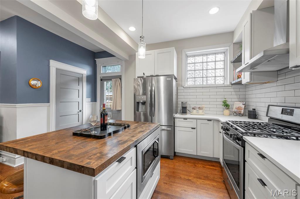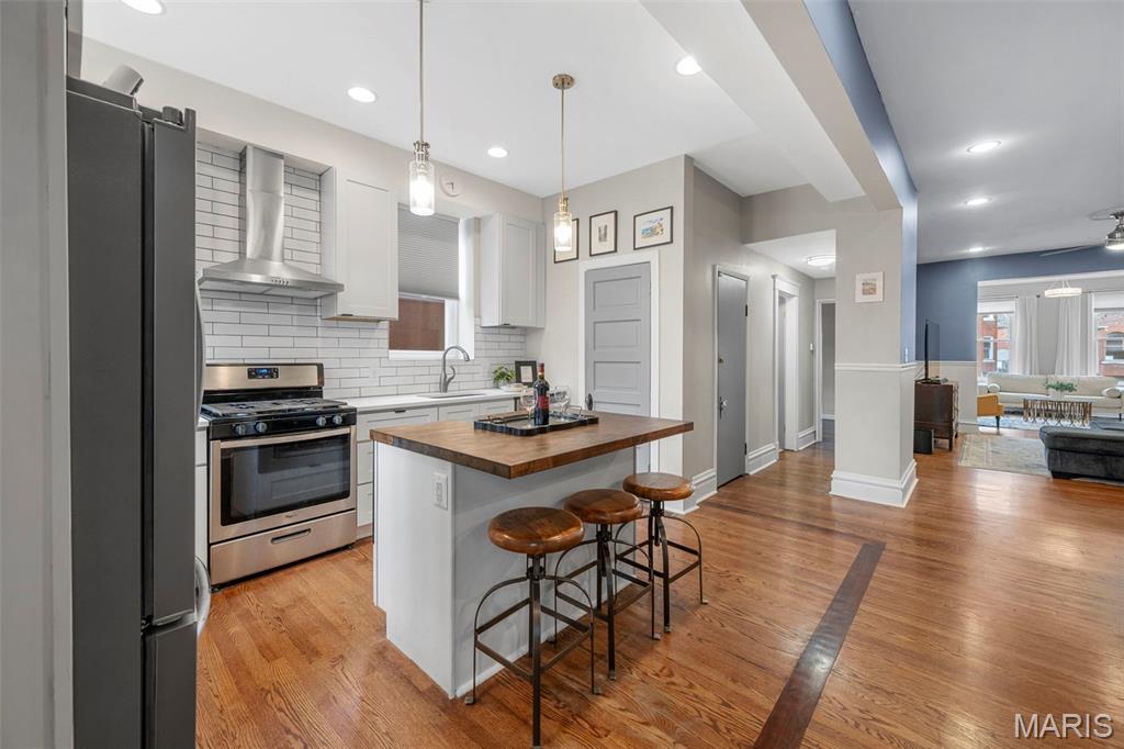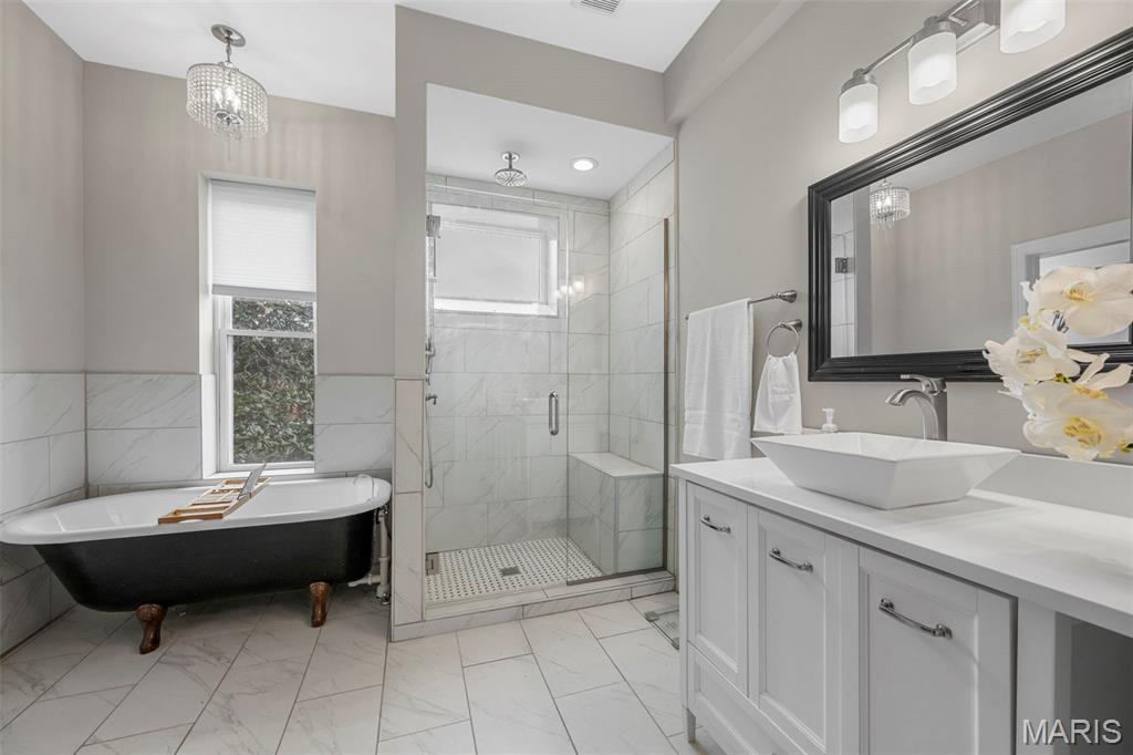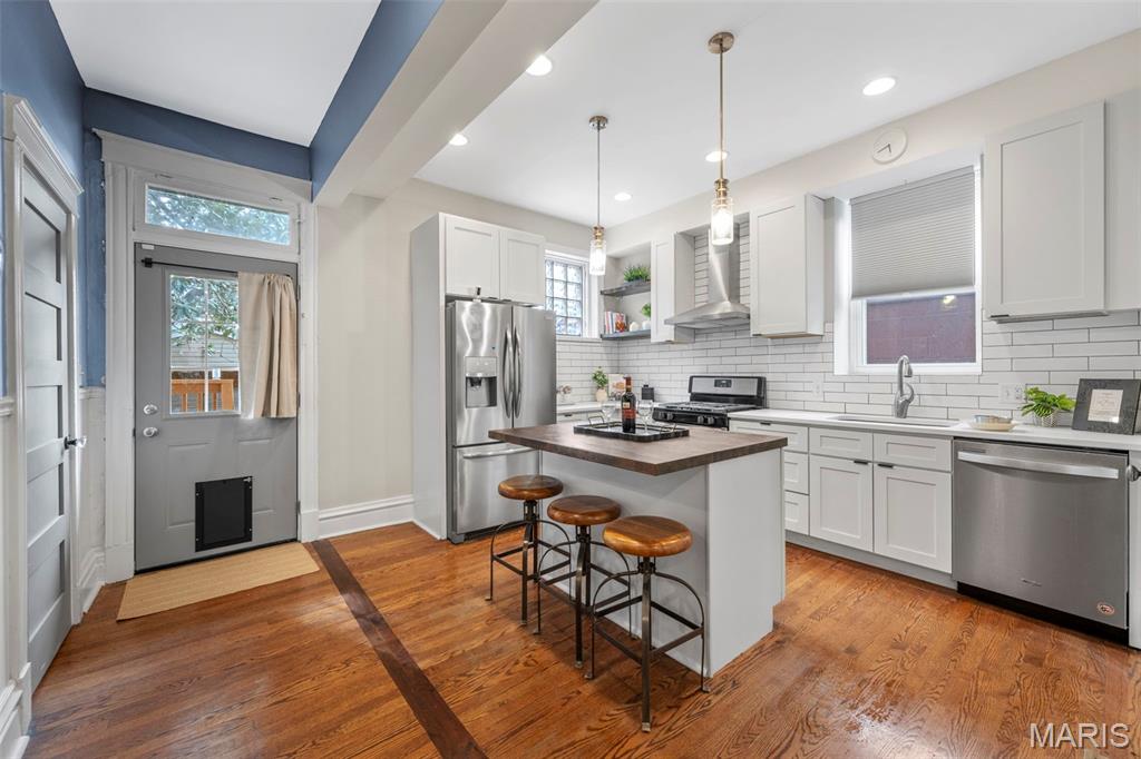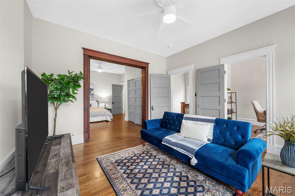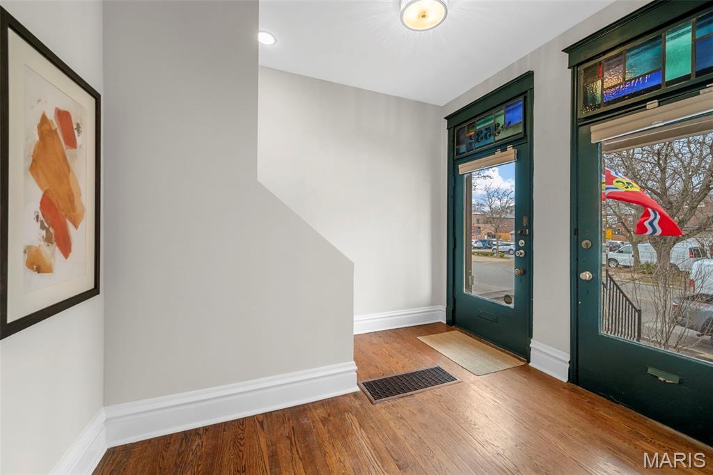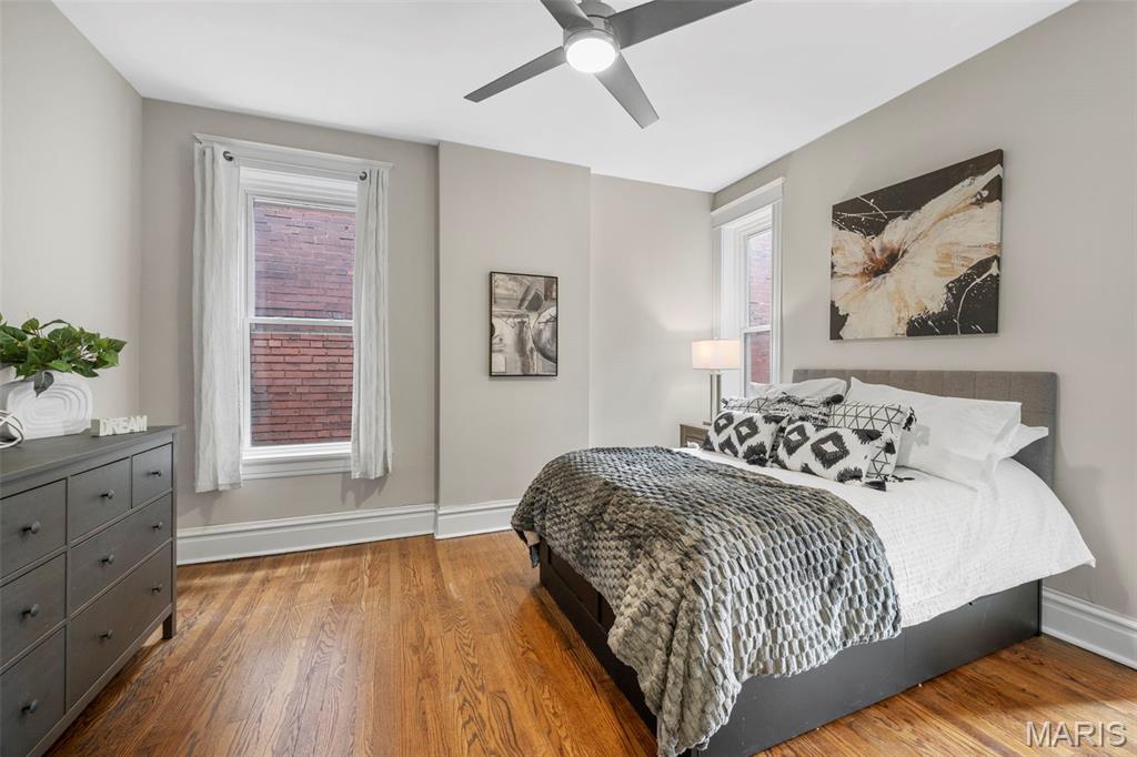 Live beautifully in the heart of Tower Grove East. This impeccably restored 1909 brick home pairs historic character with the refined updates today’s professionals expect—just moments from morning jaunts with your pets in Tower Grove Park and dinner reservations along South Grand. Inside, soaring 10-foot ceilings, rich hardwood floors, and a striking mahogany fireplace mantel create a warm, elevated atmosphere. The open-concept main level is designed for both effortless entertaining and relaxed evenings at home. The thoughtfully updated kitchen blends style and function with quartz and butcher block countertops, white shaker cabinetry, gorgeous inlaid hardwood flooring and stainless steel appliances—perfect for hosting friends or enjoying a quiet night in. Upstairs, the spacious primary suite feels like a private retreat, featuring a walk-in closet and a spa-inspired bath with a soaking tub, separate shower with new seamless glass doors, and double vanity with elegant vessel sinks. A second-floor office or large walk in closet opens to a private balcony—ideal for working from home with fresh air between meetings. Convenient second-floor laundry makes daily living seamless. Step outside to your own fenced backyard oasis with a patio for weekend grilling, space for your pup to roam, and two-carage covered parking—an exceptional convenience in the city. This is more than a home; it’s a lifestyle—walkable, architectural, and effortlessly sophisticated in Tower Grove East, one of St. Louis’ most desirable and happening neighborhoods.